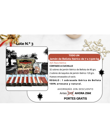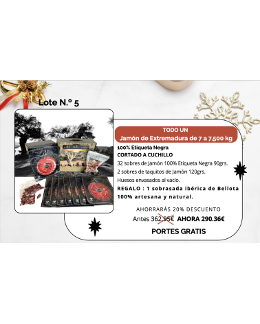 Remove from Wishlist Add to Wishlist On sale! -20% Quick view Add to cart Lote nº 5 - Jamón de Bellota Ibérico + Tacos ¡con sobre... Regular price €362.95 -20% Price €290.36 Jamón de Bellota Ibérico - Cortado a cuchillo 75% raza ibérica Este pack contiene: 20 sobres de Jamón de bellota ibérico de 80g...